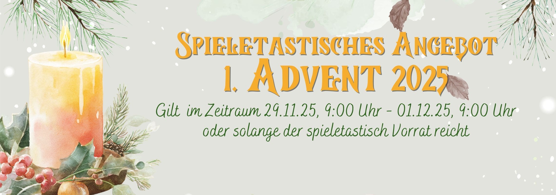 Hier euer Angebot zum 1. Advent! Das Angebot gilt im Zeitraum von Samstag, den 29.11.25 9:00 Uhr bis Montag, den 01.12.25 9:00 Uhr von und nur solange der spieletastisch Vorrat reicht.
