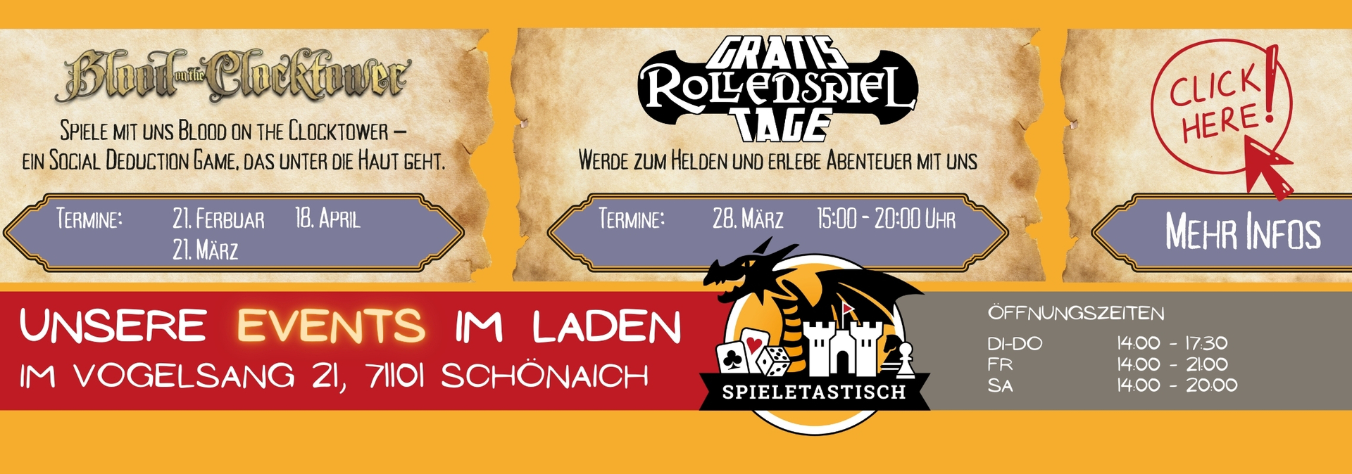 - Sa. 28.03.2026, 15:00-20:00 Uhr: Ihr könnt kostenlos in Rollenspielsysteme reinschnuppern.